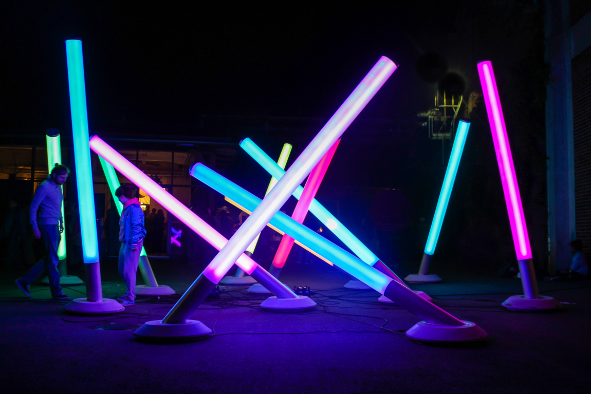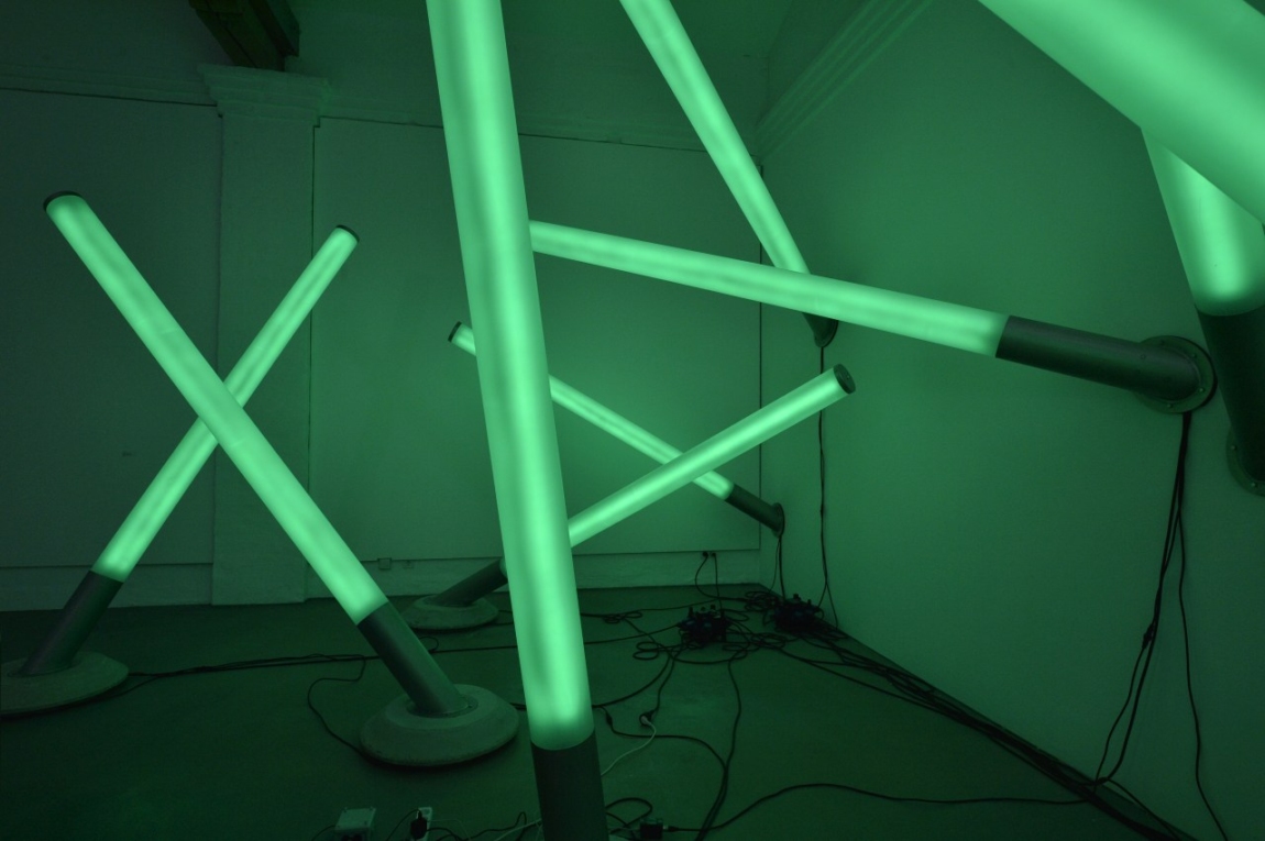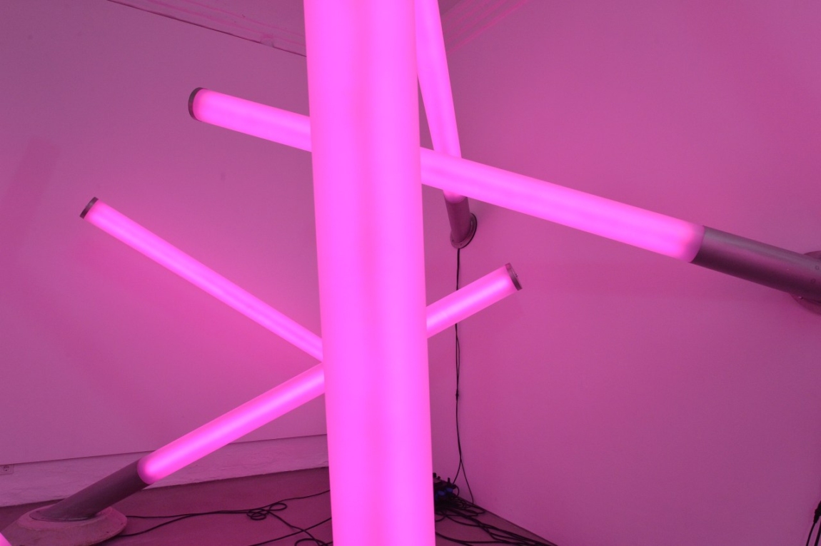 In der Ausstellung taucht der Besucher in ein Gesamtkunstwerk ein, bestehend aus Licht, Musik und Raum. Mit „Enlightenment machine“ schafft Betty Rieckmann ein Lichtinstrument, das sie in Anlehnung an das vollkommene Kunsterlebnis „Clavilux“ von Thomas Wilfred (1919) in eine eigene Formensprache übersetzt. Eine Vielzahl satinierter Rohre – jedes drei Meter lang – erstrahlt in unterschiedlichsten Farben. Über die Tasten eines Keyboards werden Töne lautlos in Lichtfarben übertragen. Dem Betrachter kommt eine interagierende Rolle zu. Im Spiel mit den Farben wird er selbst zum Komponisten und Choreographen.