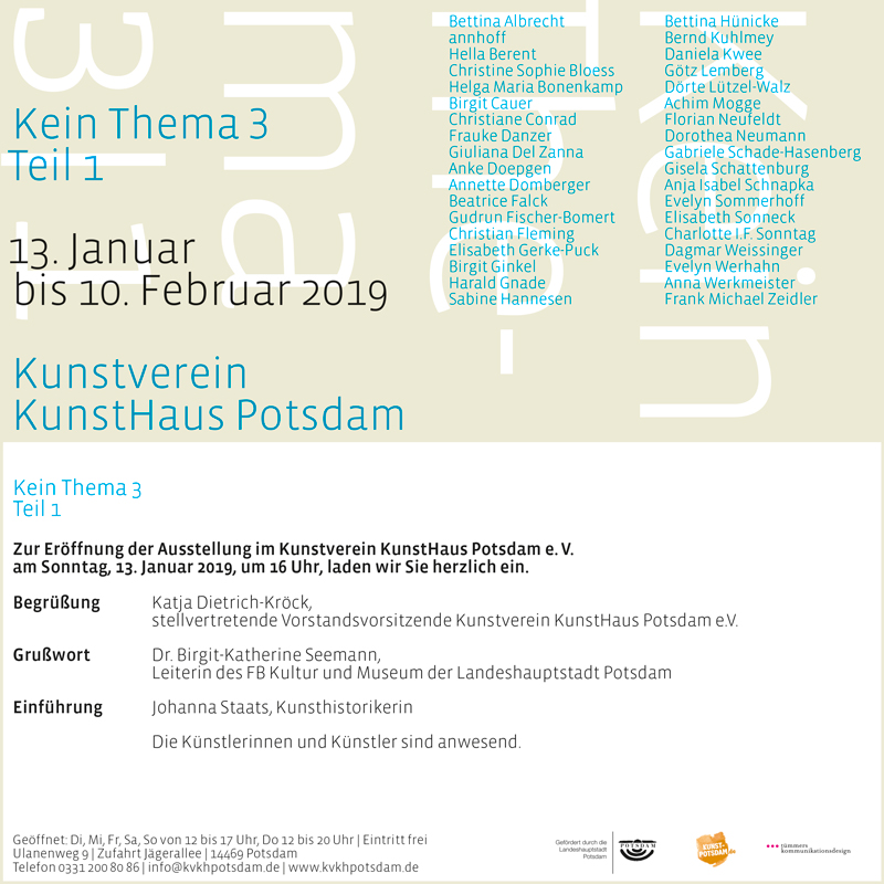 Zum Jahresauftakt 2019 präsentiert das KunstHaus Potsdam als mitgliederstärkster Kunstverein in Brandenburg wieder einen Querschnitt aus dem aktuellen Schaffen seiner Künstler*innenmitglieder. Die Vielfalt der künstlerischen Themen, Medien und Ansätze sind Schwerpunkt der Ausstellungsreihe Kein Thema, die zum dritten Mal stattfindet. In zwei Hängungen, beginnend mit Teil 1 vom 13. Januar bis 10. Februar 2019, füllen Werke unterschiedlichster Sujets und Fragestellungen die großzügige Ausstellungshalle und können erworben werden – auch das ist „kein Thema“. Doch die Ausstellung repräsentiert auch die Arbeit des Kunstvereins KunstHaus Potsdam seit seiner Gründung im Jahre 2002, die geprägt ist von Dialog und Austausch, Aufmerksamkeit, vertiefender Betrachtung, Zusammenkunft und Respekt.