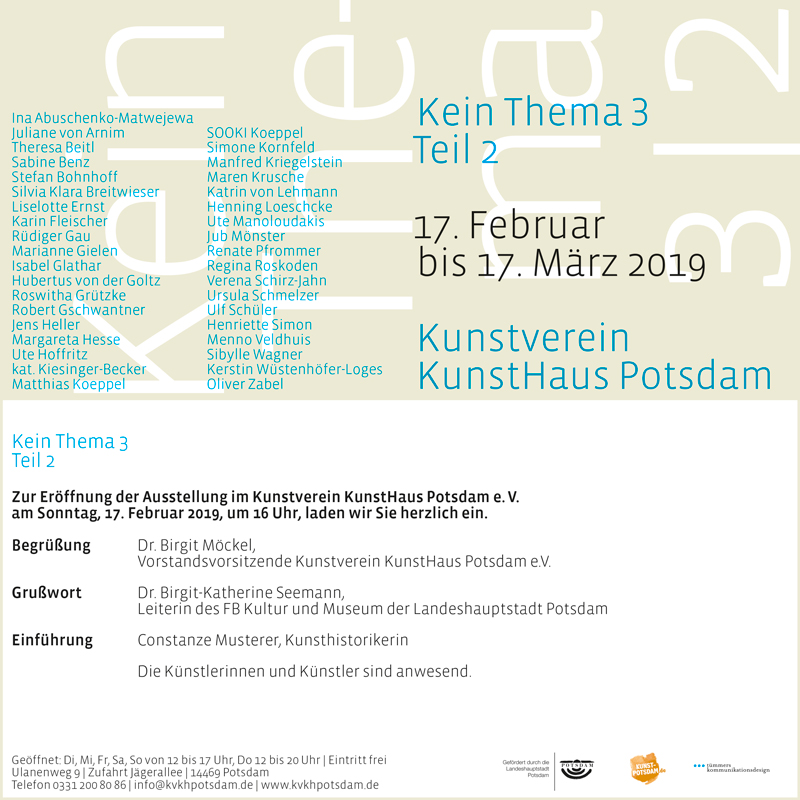 Kein Thema: Unter diesem Motto zeigt der Kunstverein KunstHaus Potsdam jetzt im dritten Jahr ausgewählte Positionen seiner Künstler*innenmitglieder. In diesem Jahr in zwei aufeinanderfolgenden Hängungen, um ausreichend Raum für alle zu bieten. 37 Künstlerinnen und Künstler aus der Hauptstadtregion Potsdam – Berlin und darüber hinaus sind mit exemplarischen Beispielen aus ihrem Schaffen zu entdecken. Alle präsentierten Arbeiten wurden von den Vorstandsmitgliedern und kunsthistorisch versierten Mitarbeiterinnen des Kunstvereins gemeinsam mit den Künstlerinnen und Künstlern in den Ateliers ausgewählt. Mit rund 50 Werken öffnet sich ein spannender Querschnitt von Medien, Themen und unterschiedlichsten künstlerischen Sprachen. Ungeahnte Einsichten, Dialoge, Parallelen, Schwerpunktsetzungen sowie vielschichtige visuelle Erfahrungen und Perspektivwechsel sind zu erleben.
