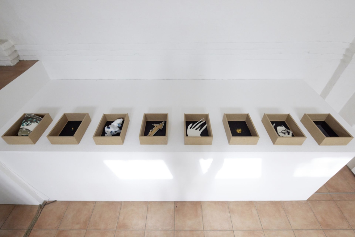 Last but not least gibt es Inhalte der Kisten zu entdecken und zu interpretieren. An archäologische Funde erinnernd holt Lottje den Jahrhunderte alten menschlichen Willen zur Kriegsführung in den Ausstellungsraum und eröffnet Assoziationsmöglichkeiten. Waffen erscheinen in der Ambivalenz zu Fundstücken. Diesem Deutungswillen folgend, wird der Betrachter bei einer der Kisten staunen: eine Hand mutiert zu einem Dreizack!
