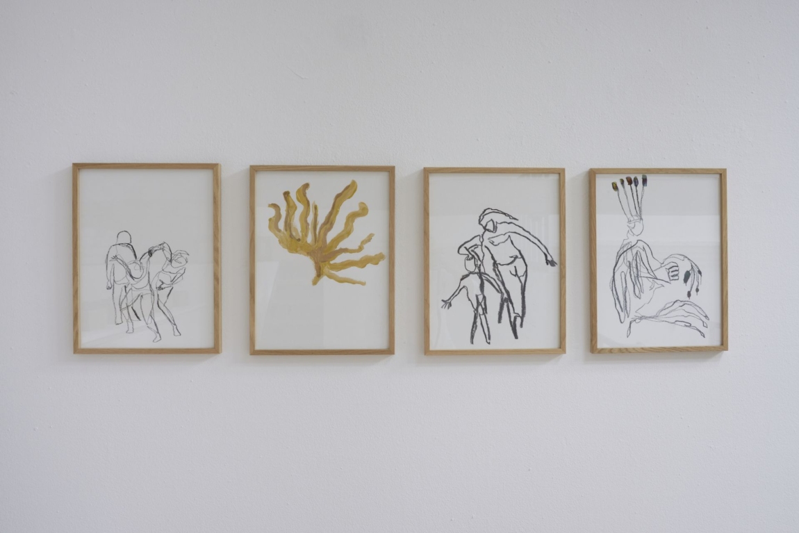 Ähnlich kleinformatig, kontrastierend und ergänzend zu der großformatigen Wandcollage, sehen wir weitere Zeichnungen von Petra Lottje. Hier geht sie einerseits spielerisch mit Aquarelltechnik um, lässt sich freudvoll auf beinahe unberechenbaren Farbverläufe ein, die an Unterwasserwelten erinnern, während sie sich in anderen Zeichnungen erneut auf situative zwischenmenschliche Situationen konzentriert.