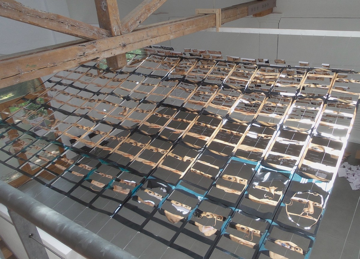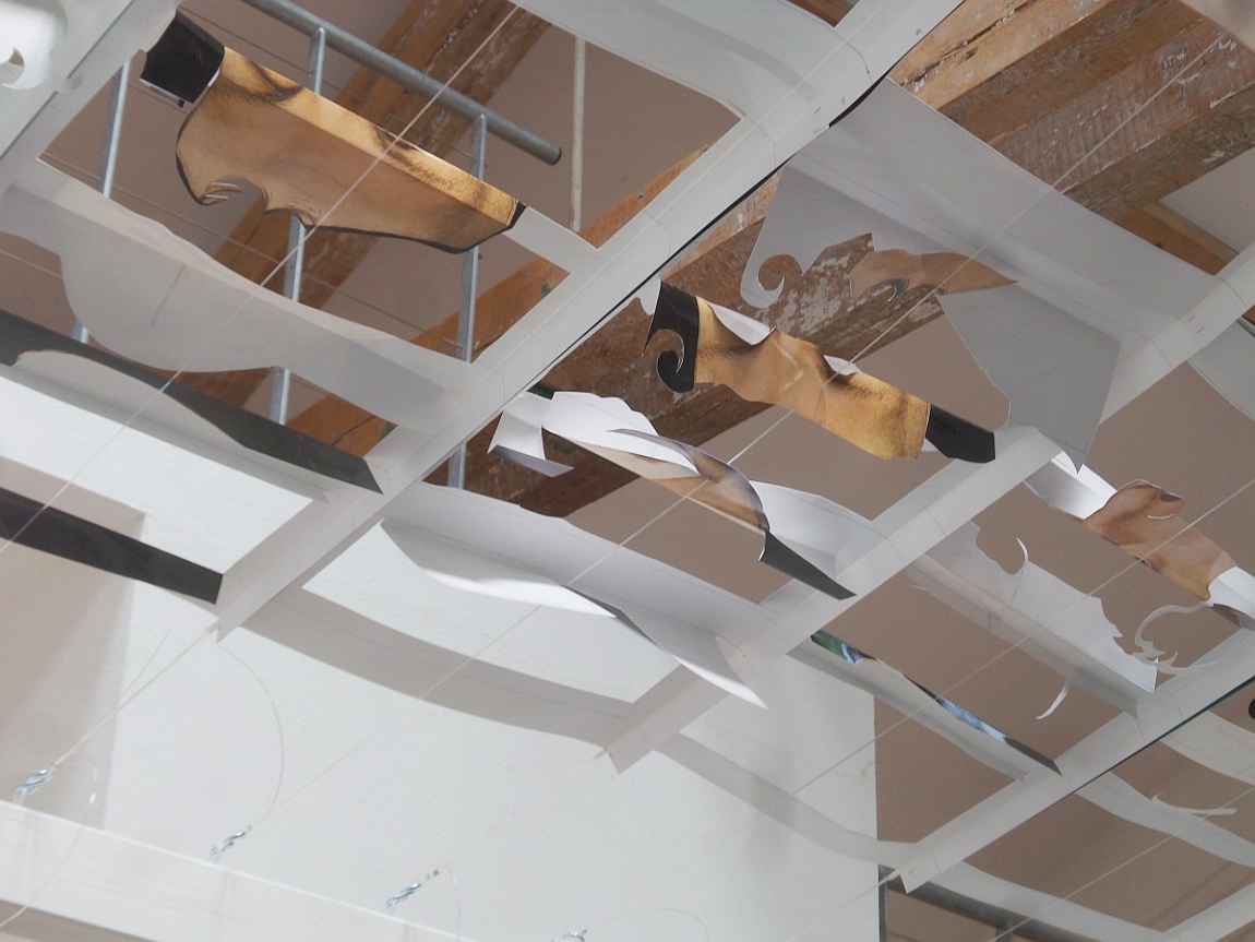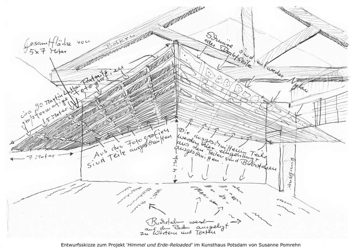 In ihrer raumgreifenden Installation richtet die Künstlerin Susanne Pomrehn den Fokus auf die immense Bedeutung medialer Aspekte im Zusammenhang mit der Person Martin Luthers, mit seinem Wirken sowie mit der Ausbreitung und den Folgen der Reformation. So trug die weite Verbreitung von Porträtdarstellungen Martin Luthers maßgeblich zu seiner Bekanntheit bei. Die massenhafte Produktion und Verbreitung seiner Schriften, die durch den Buchdruck ermöglicht wurde, beförderte den Ideentransport der Reformation. Der in seinem Umfang neue Einsatz medialer Mittel in Bild und Wort war somit maßgeblich an den politischen und gesellschaftlichen Veränderungen beteiligt. Im Detail analytisch, invasiv und dekonstruktivistisch seziert die Künstlerin ihr Grundmedium, die Fotografie, mit dem Skalpell, entnimmt dem Bild das Wort, hinterlässt damit Leerstellen und fügt die entnommenen Teile in neue Konstellationen ein, so dass ein skulpturales Werk als Raumkörper von hoher ästhetischer Kraft entsteht, der den gesamten Ausstellungsraum erfüllt.