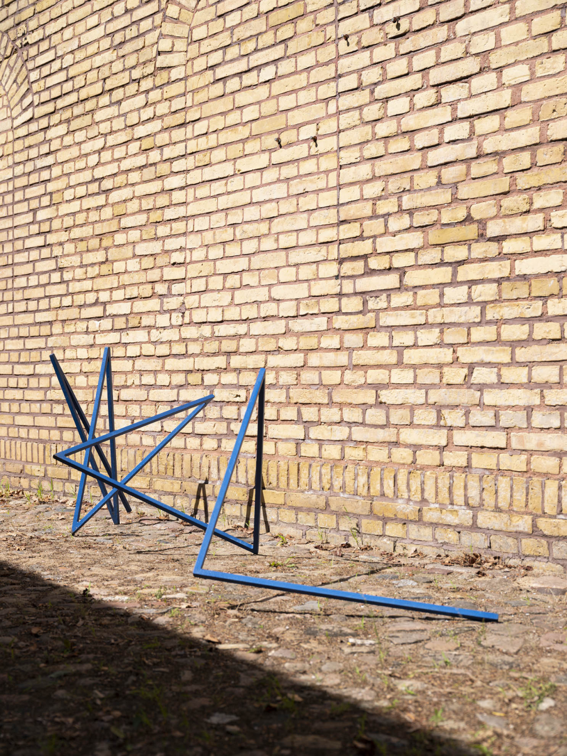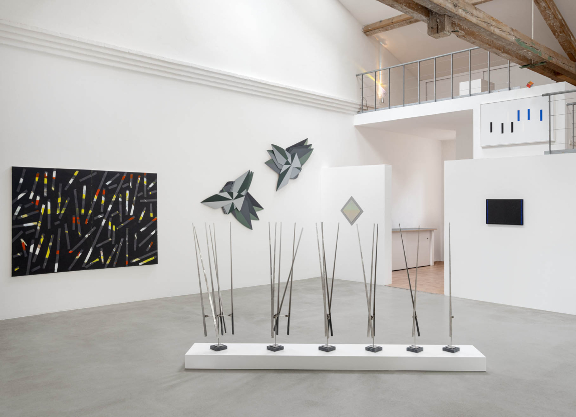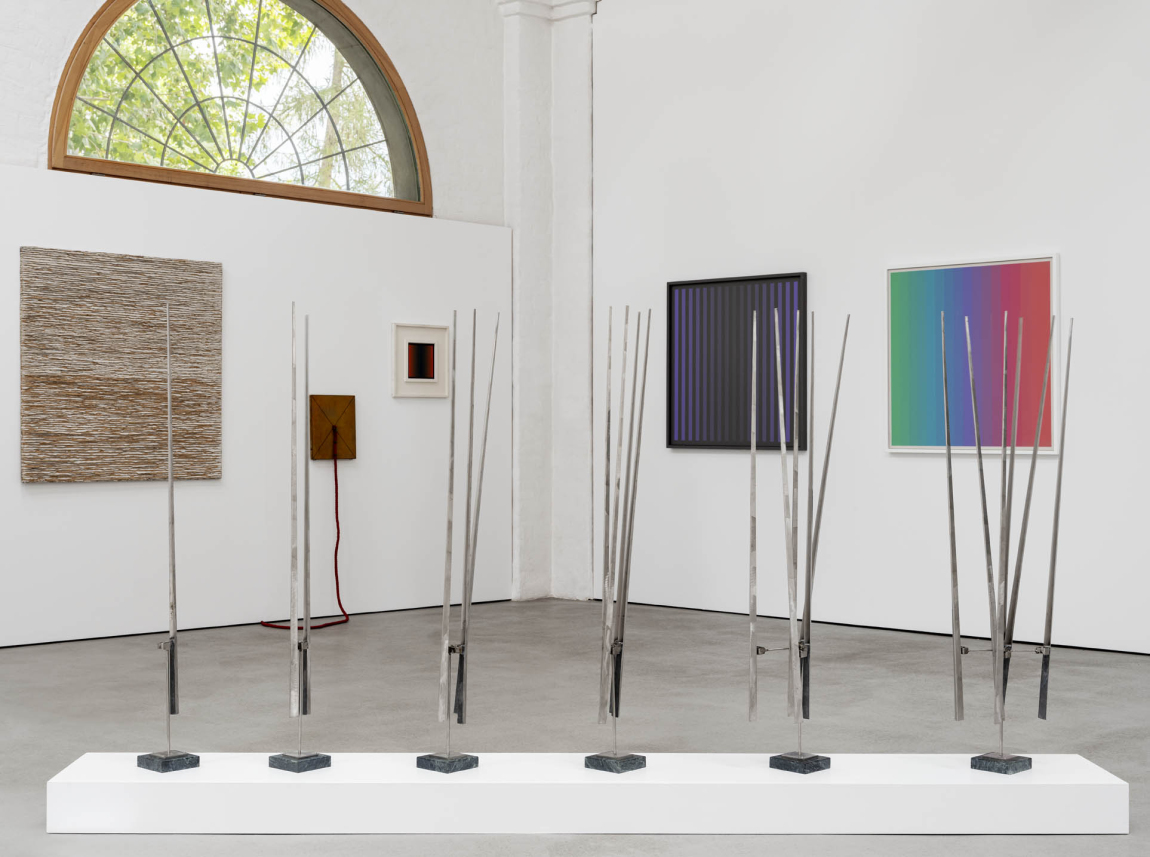 Ein großer Dank geht zudem an die Berlinische Galerie, die mit der Leihgabe der Skulptur von George Rickey Peristyl IV von 1973 die Ausstellung eindrucksvoll und historisch komplettiert. Sechs einzelne, vertikal ausgerichtete filigrane Stabkonstruktionen aus Stahl entwickeln eine gemeinsame Bewegung und Dramaturgie, indem der Künstler jedem Einzelobjekt einen Stab mehr hinzufügte und deren Positionen variierte. Luftzug bewegt die einzelnen Stäbe, was deren Ausrichtung verändert, ohne dass sie sich jemals berühren.