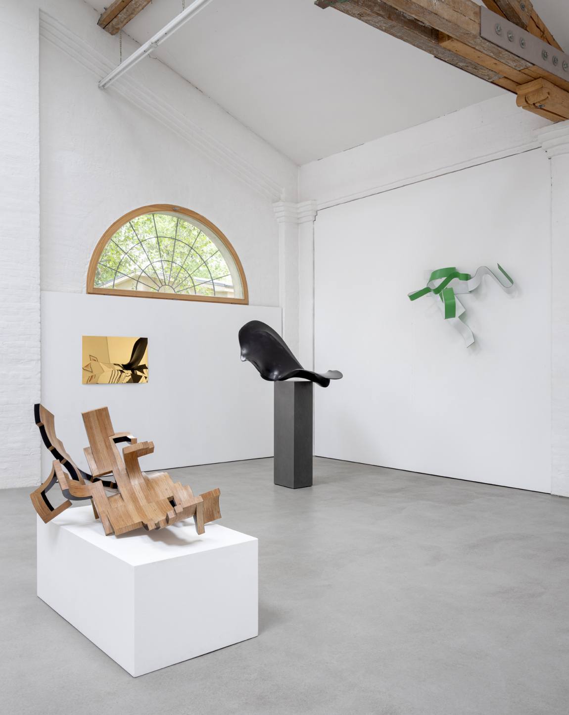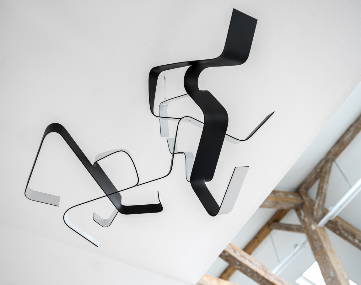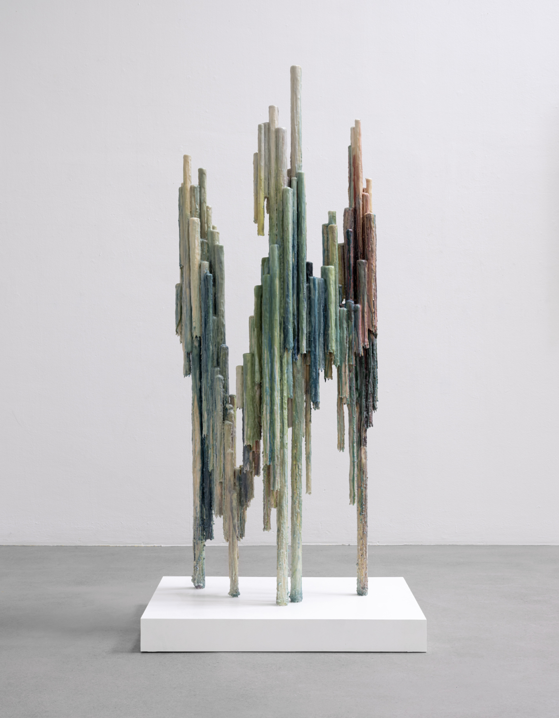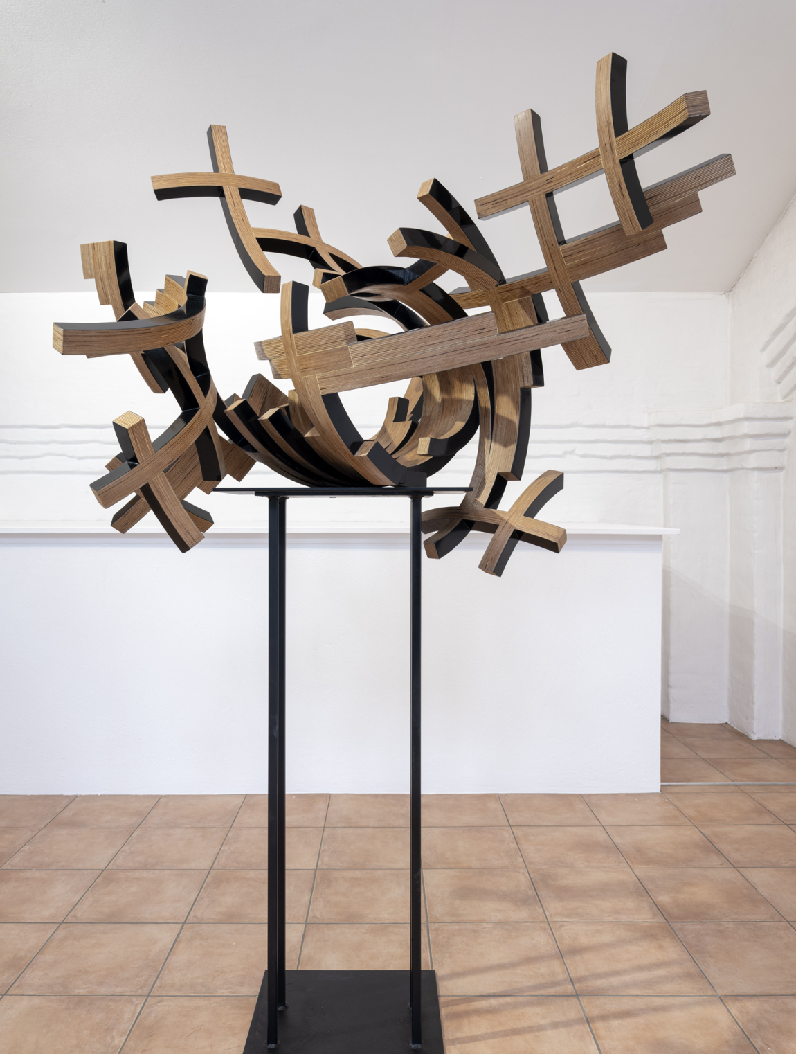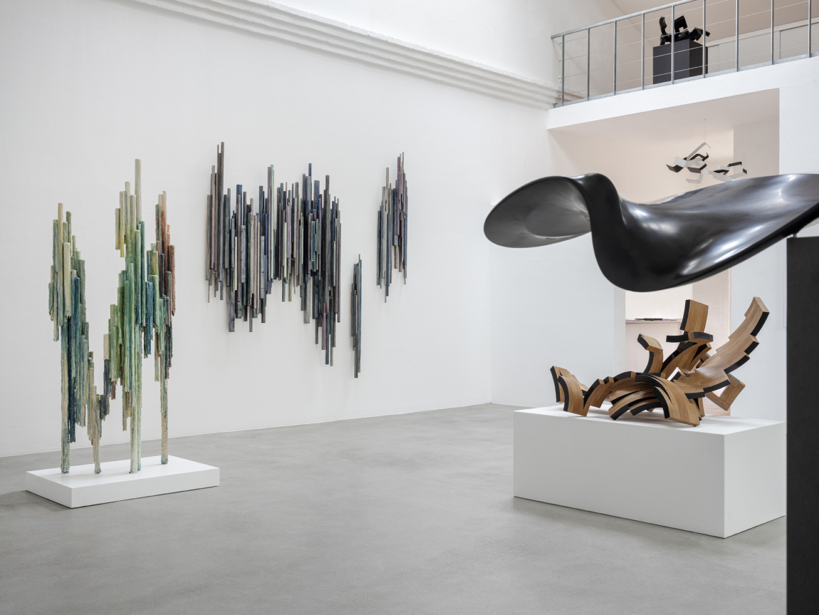 Zeichnungen. Hierzu wirken die feingliedrigen, vertikal strukturierten skulpturalen Werke von Kavata Mbiti aus kantigen Holzstäben im Zusammenspiel mit ihren großformatigen, so poetischen wie expressiven Papierarbeiten, wie ein richtungsweisender Kontrast. Die Einschnitte, Faltungen und Biegungen von Jan Großmann erkunden in freien Formationen und klaren Farbkontrasten den Raum, während die Skulpturen und Reliefarbeiten von Axel Anklam mit ihren diffizilen Oberflächenreizen, transparent oder spiegelnd, den Raum mit scheinbar schwereloser Leichtigkeit aufnehmen und das Licht als wandlungsfähigen Komplizen einbinden.