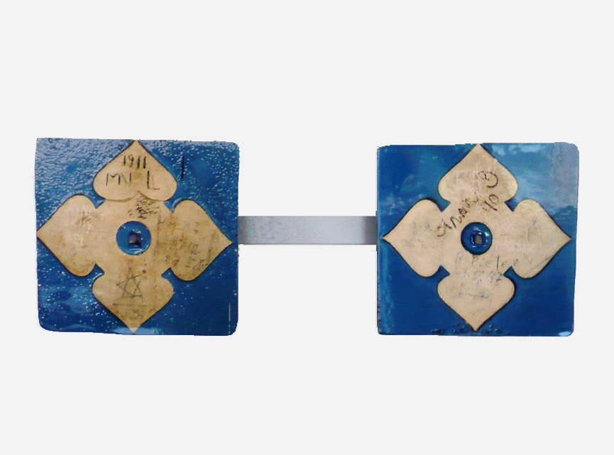 Blaue Fotofliesen-Objekte, je als „Pärchen“ aufgespießt auf silberfarbene(n) Metall-Wand-halter(n)